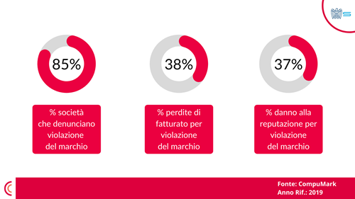 Una ricerca di Compumark dimostra che circa l’85% delle aziende internazionalizzate ha subito una violazione del marchio, con conseguenti perdite in termini di identità (45%), fatturato (38%) e reputazione del marchio (37%).